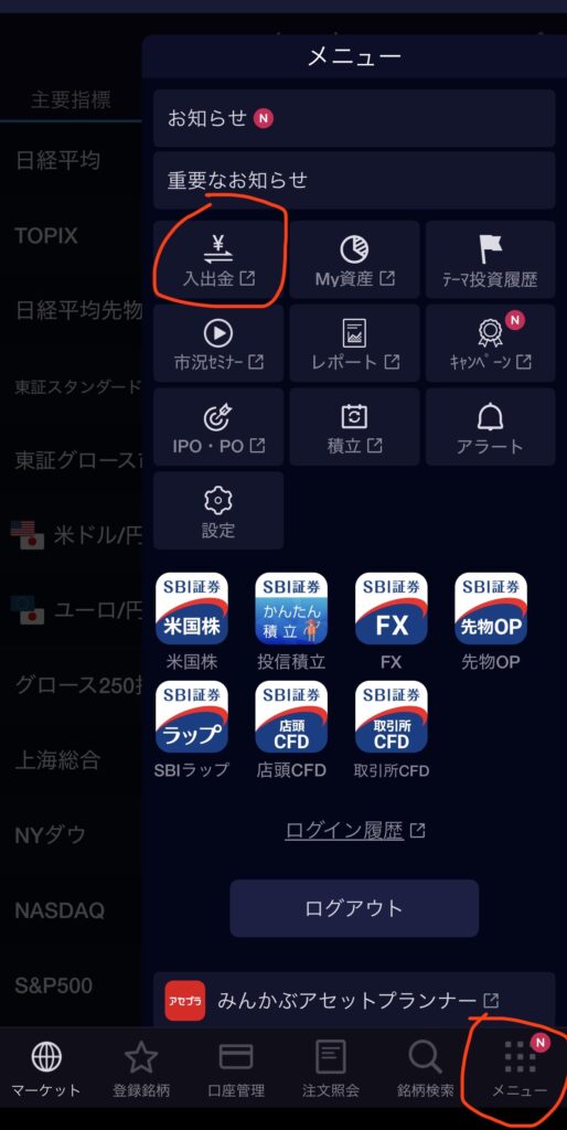 SBI証券のアプリなら右下のメニューをタップすると入出金のボタンが出てくるよ↓