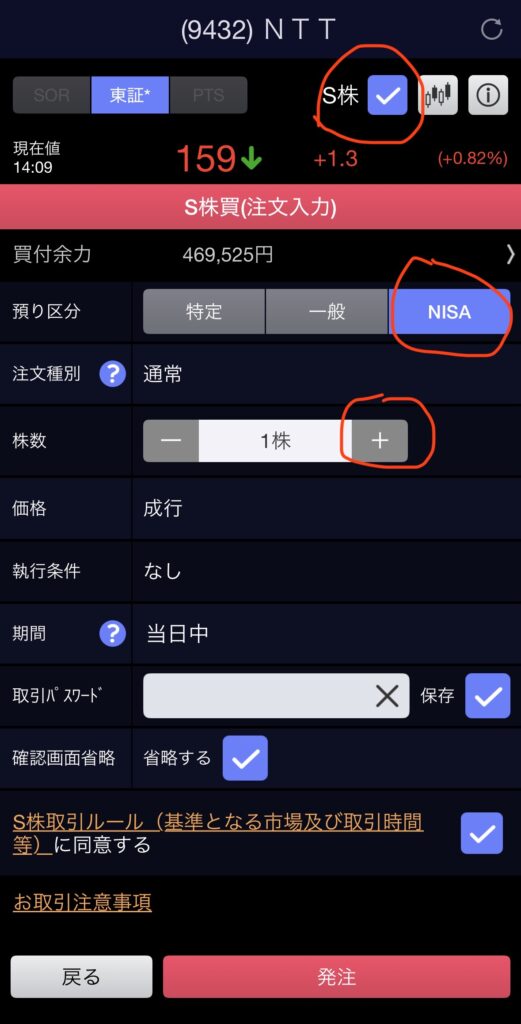 【S株】のチェックボックスをタップして、NISAを選択し、株数を選んで注文します👇