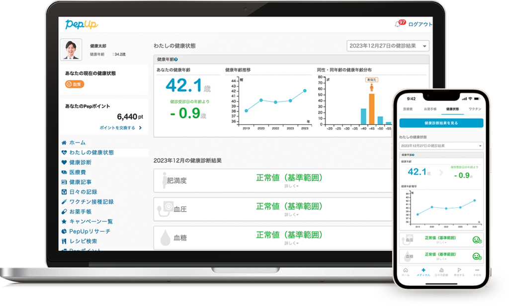 今は製薬会社へのデータ販売だけでなく、保険会社向けのサービス開発や、スマホで自分の健康データを確認できるアプリ「PepUp(ペップアップ)」など、「データで医療を効率化する」ための多角的な事業を展開する、ヘルステックの巨人😊
