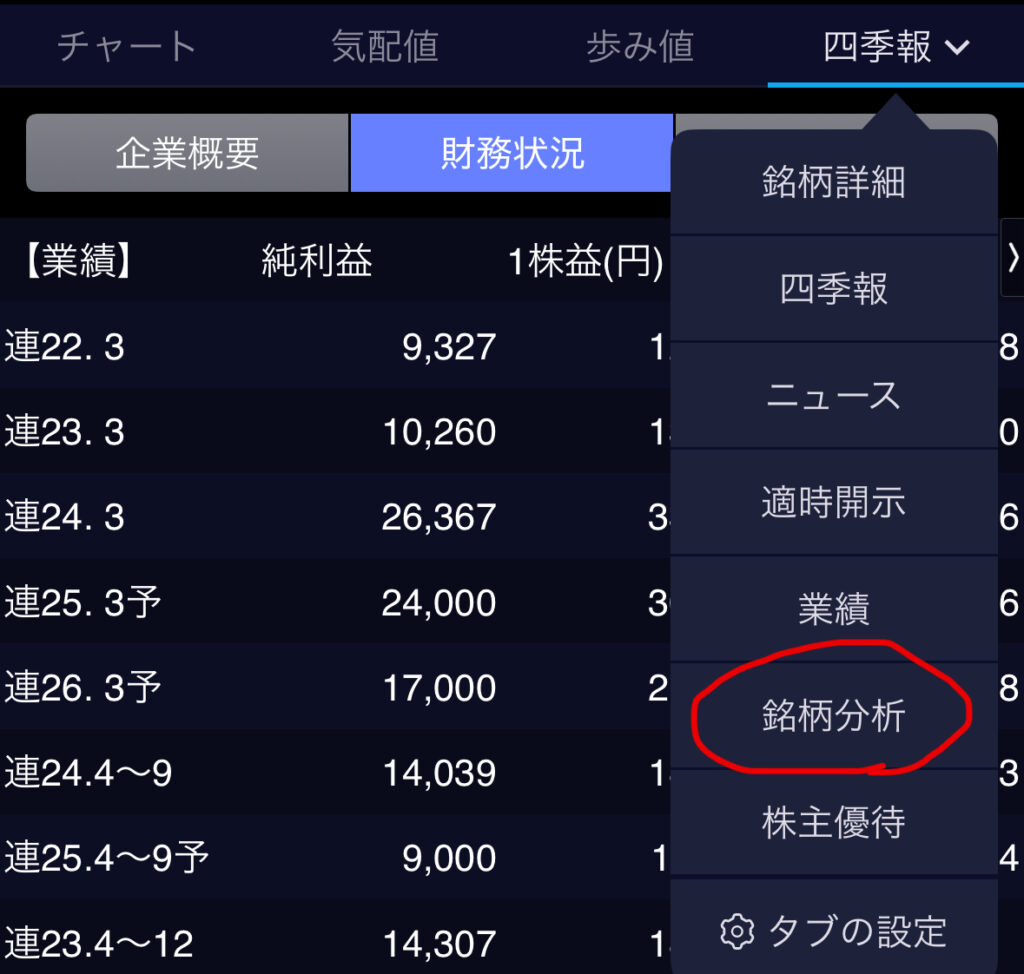 PERが何倍になっているのかを確認する。「銘柄分析」をタップして、